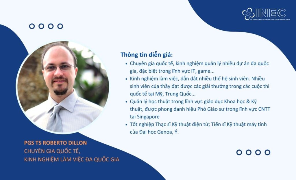 Mời bạn đến với Hội thảo các nước do INEC tổ chức tại TP. Hồ Chí Minh để nhận thêm thông tin và sự tư vấn hữu ích giúp chọn ngành, chọn nghề chính xác hơn! Diễn giả khách mời – PGS TS. Roberto – một chuyên gia quốc tế có kinh nghiệm học tập, giảng dạy và làm việc trong nhiều dự án đa quốc gia đang sẵn sàng đem đến góc nhìn cận cảnh bức tranh xu hướng nghề nghiệp trên thế giới hiện nay.