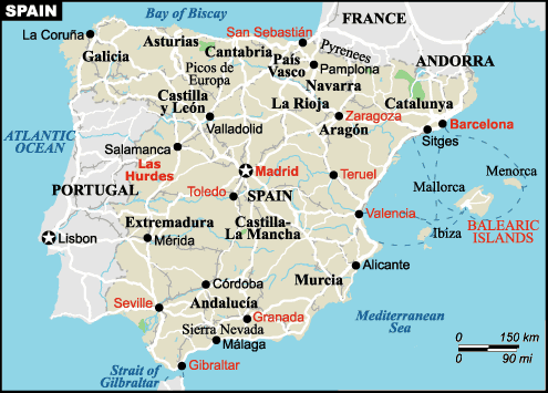 – Là Quốc gia nằm trên bán đảo Iberia phía Tây Nam Châu Âu. Phía bắc giáp Pháp, phía tây giáp Bồ Đào Nha, phía đông giáp Địa Trung Hải, phía nam giáp eo biển Gibraltar nối liền Bắc Phi.